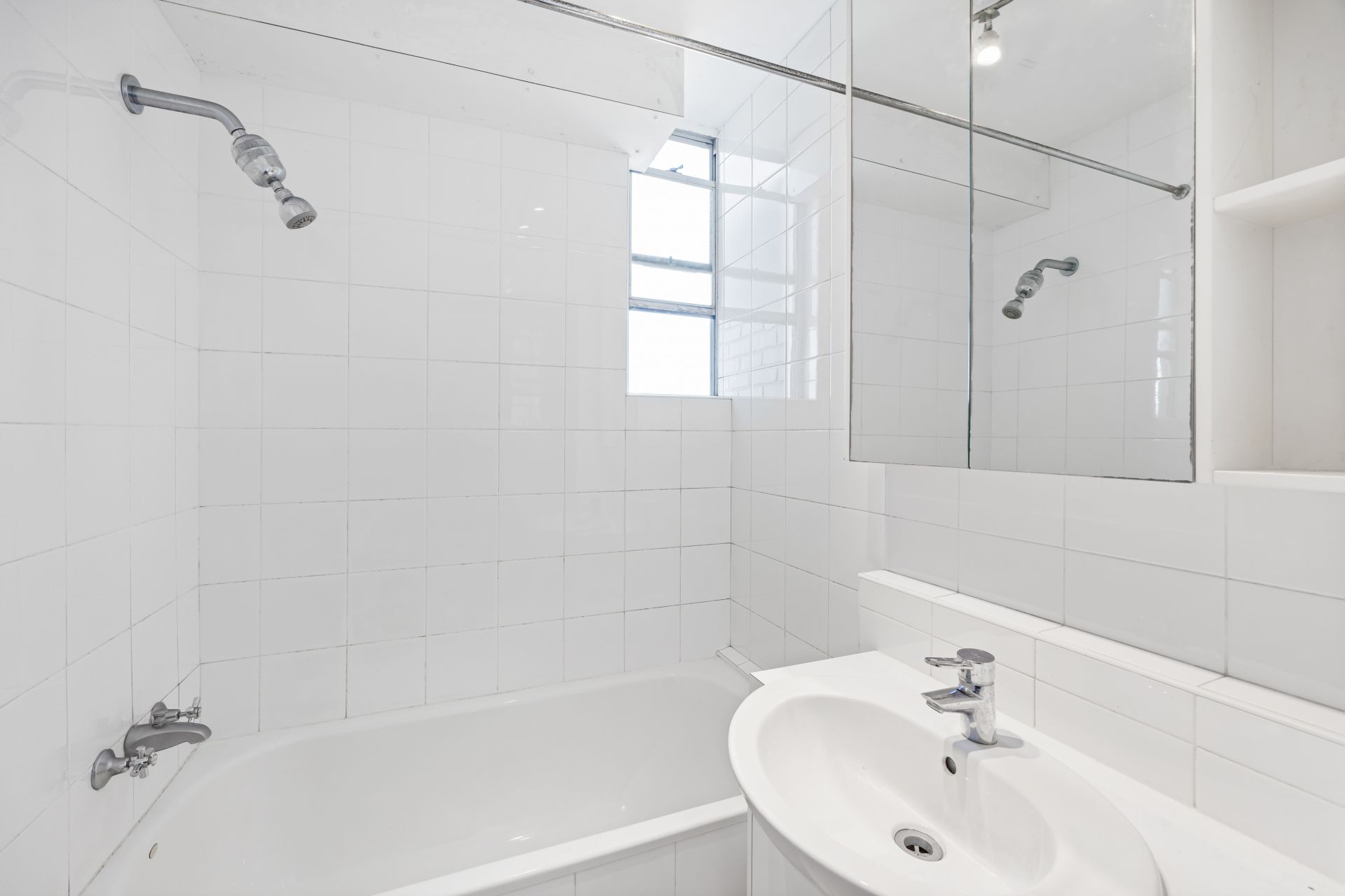 Light-Filled Kitchen & Bath: A well-lit kitchen and bathroom with a combined shower and tub.